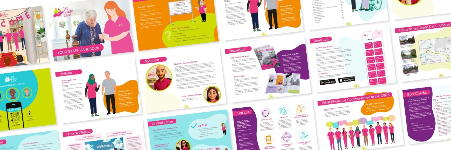 We partnered with 1st Grade Care to create a warm, human-centred brand identity that reflects their values and their story. From logo and brand guidelines to event collateral and a standout staff handbook, we delivered a suite of assets that balance professionalism with personality.